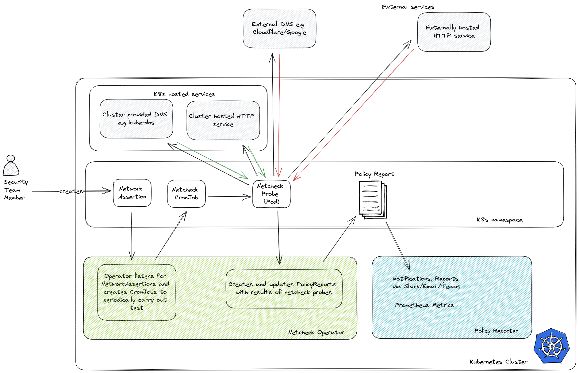and run the tests that make up a particular network assertion. External data may be mounted into the Pod for use by the probe. - Listens for probe Pods created by the NetworkAssertion's CronJob and parses assertion results from the Pod logs.